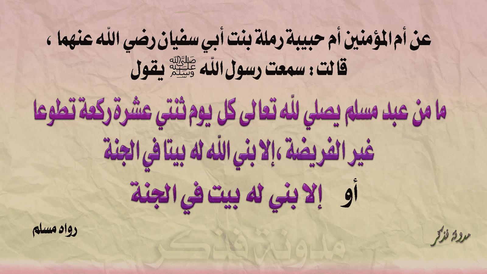 شرح حديث ما من عبد مسلم يصلي لله تعالى كل يوم ثنتي عشرة ركعة تطوعا غير الفريضة مدونة فذكر