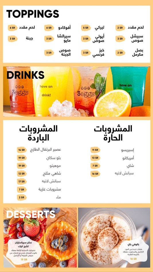 مطعم ثري ايجز 3eggs المنيو وارقام التواصل لجميع الفروع